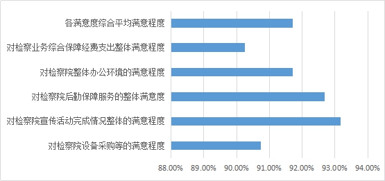 包括对检察院设备采购等的满意程度、对检察院宣传活动完成情况整体的满意程度、对检察院后勤保障服务的整体满意度、对检察院整体办公环境的满意程度、对检察业务综合保障经费支出整体满意程度等。