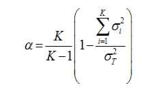 其中表示问卷中问题的数目,为第个问题得分的方差,为总得分的方差。